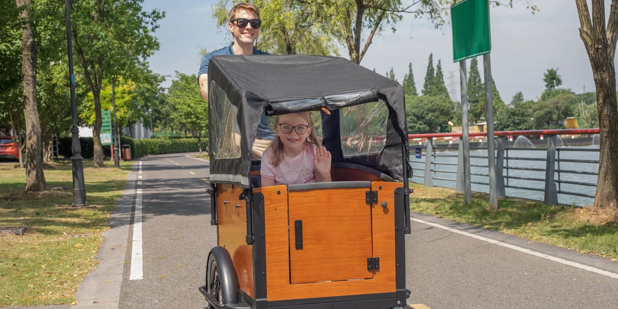 Caboo Cargo Bike - Family S er udstyret med en sikkerhedssele til børn, en blød læderpude, et sikkerhedsarmlæn og en anti-skrid måtte. Du kan også tilføje det tilbehør, du har brug for.