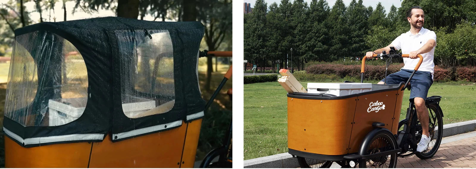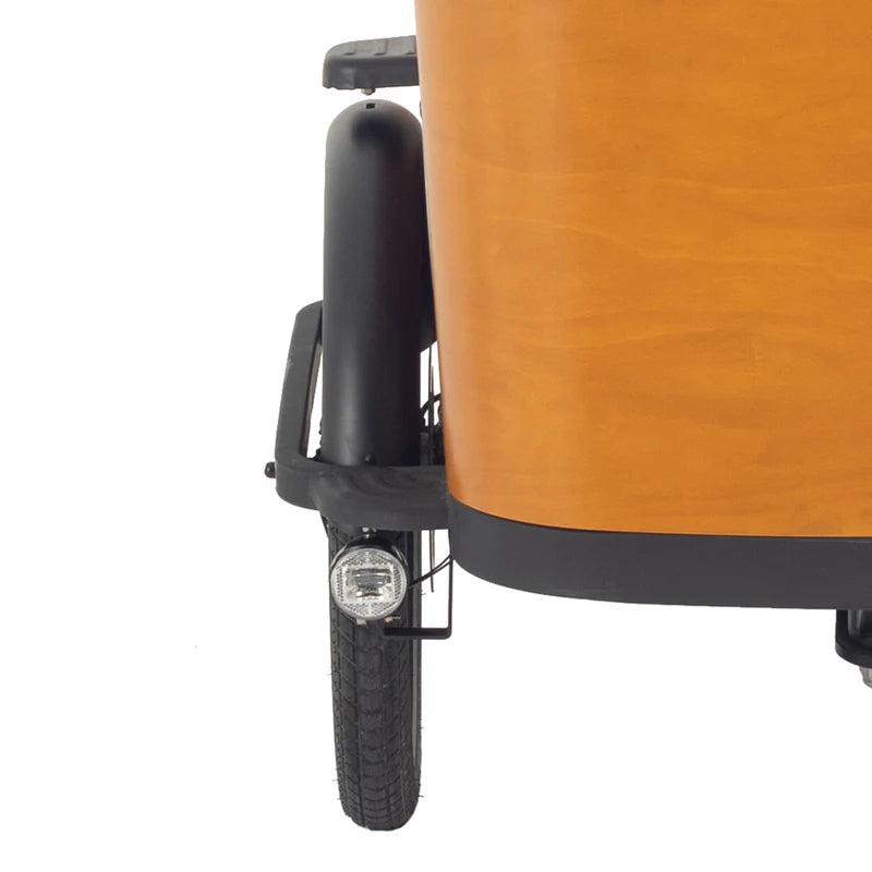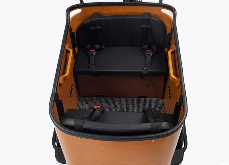 The Caboo Cargo Bike - Family C is equipped with a child safety belt, a soft leather cushion, a safety armrest and an anti-slip mat. You can also add the accessories you need.